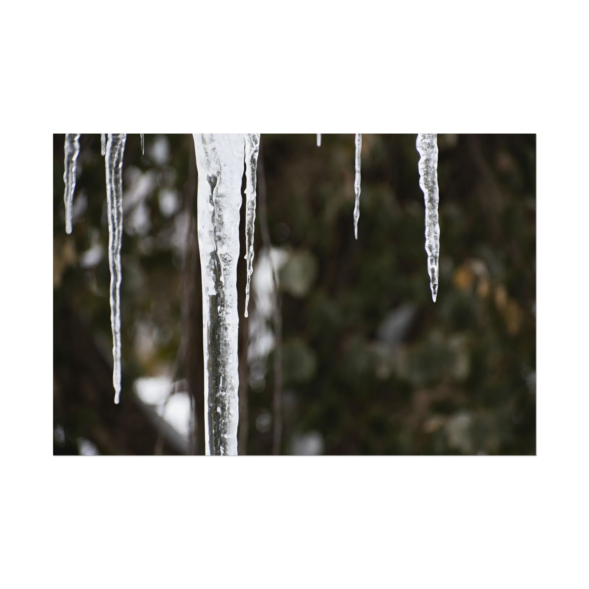 A close-up of icicles suspended against a soft, blurred outdoor backdrop captures crisp winter light and transparent textures, giving a calm, cold, and contemplative mood. Choose from three paper types — fine art textured paper for archival, painterly depth; semi-glossy photo paper for vivid color and sharp detail; or matte for a softer, museum-style finish. Available in multiple sizes in a landscape orientation, these prints slip easily into gallery clips or frames and bring a quiet, wintry stillness to living rooms, cabins, studios, or entryways. Perspective will vary slightly based on size chosen - to compare, select the 'Fine Art' paper choice.