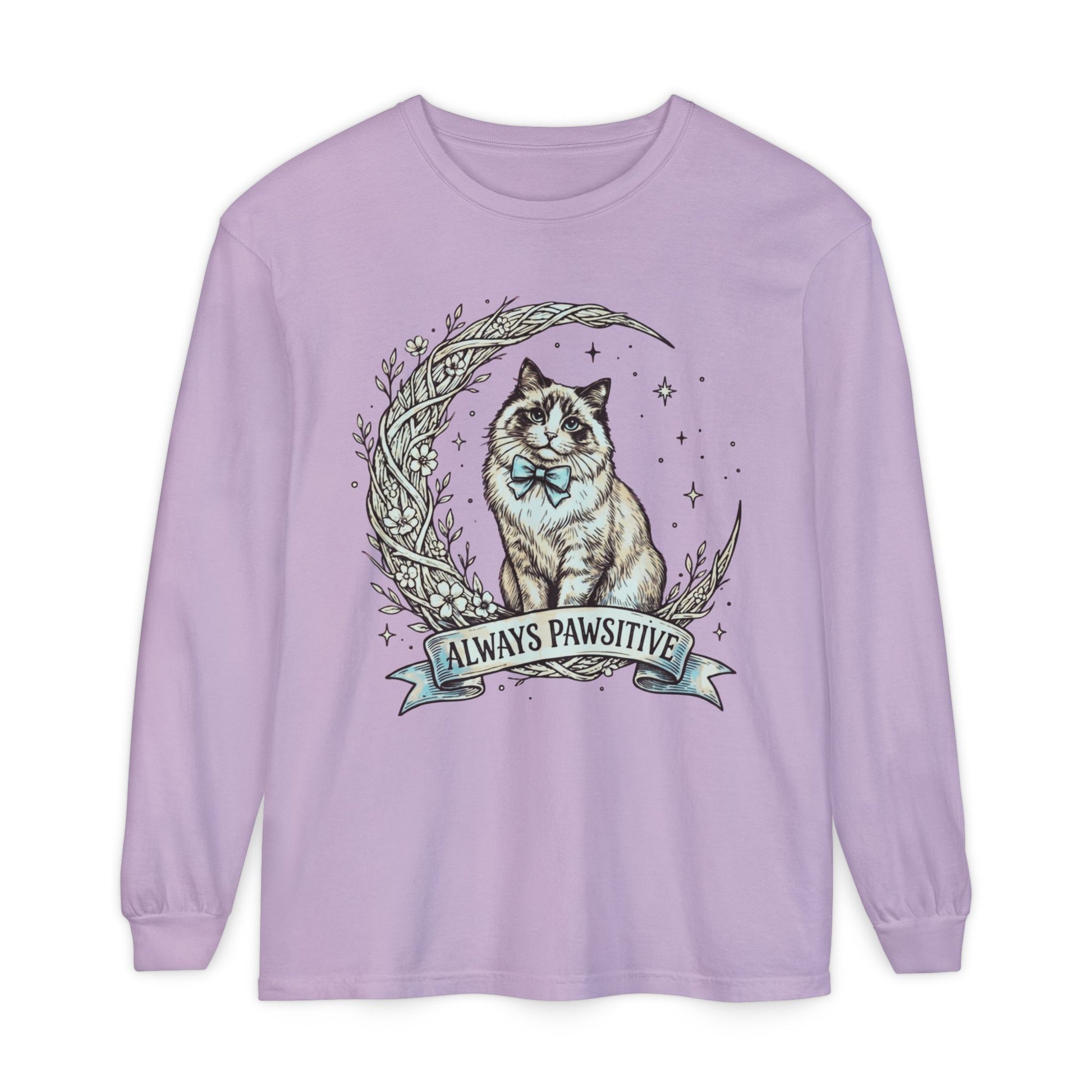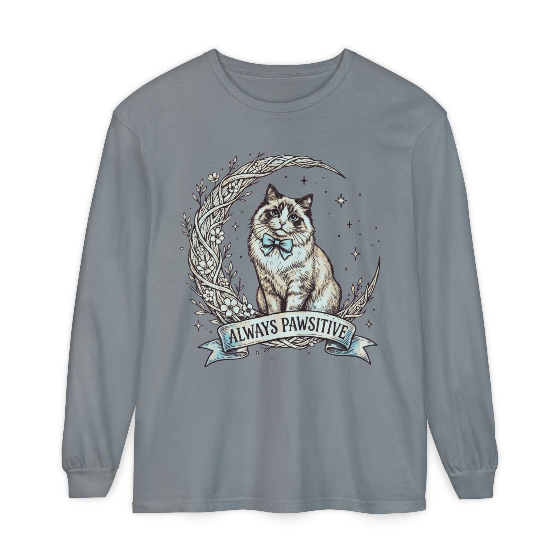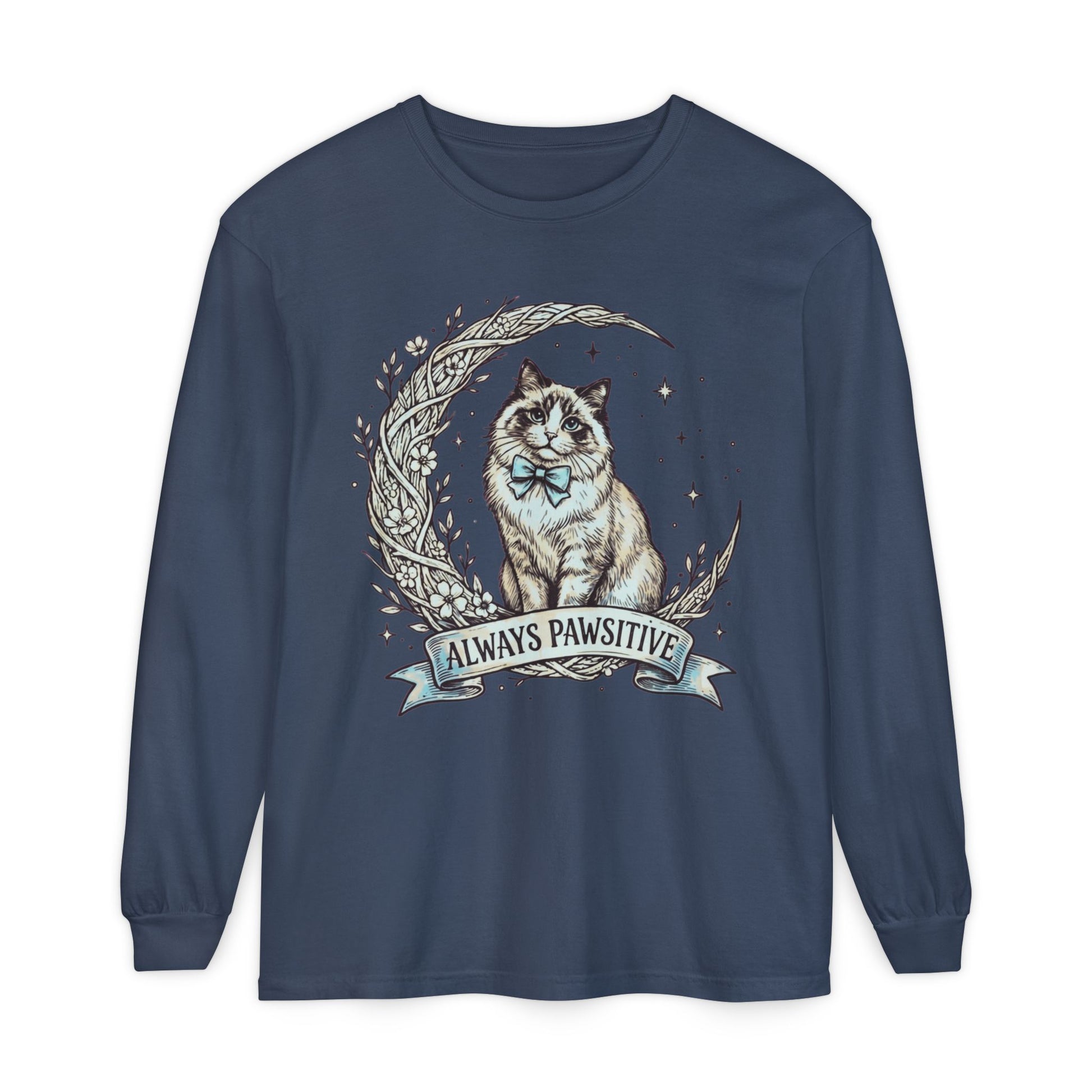 Unisex Adult 'Always Pawsitive' Cat Design Long Sleeve Tee — Cute Ragdoll Cat Graphic Shirt (Additional Colors)