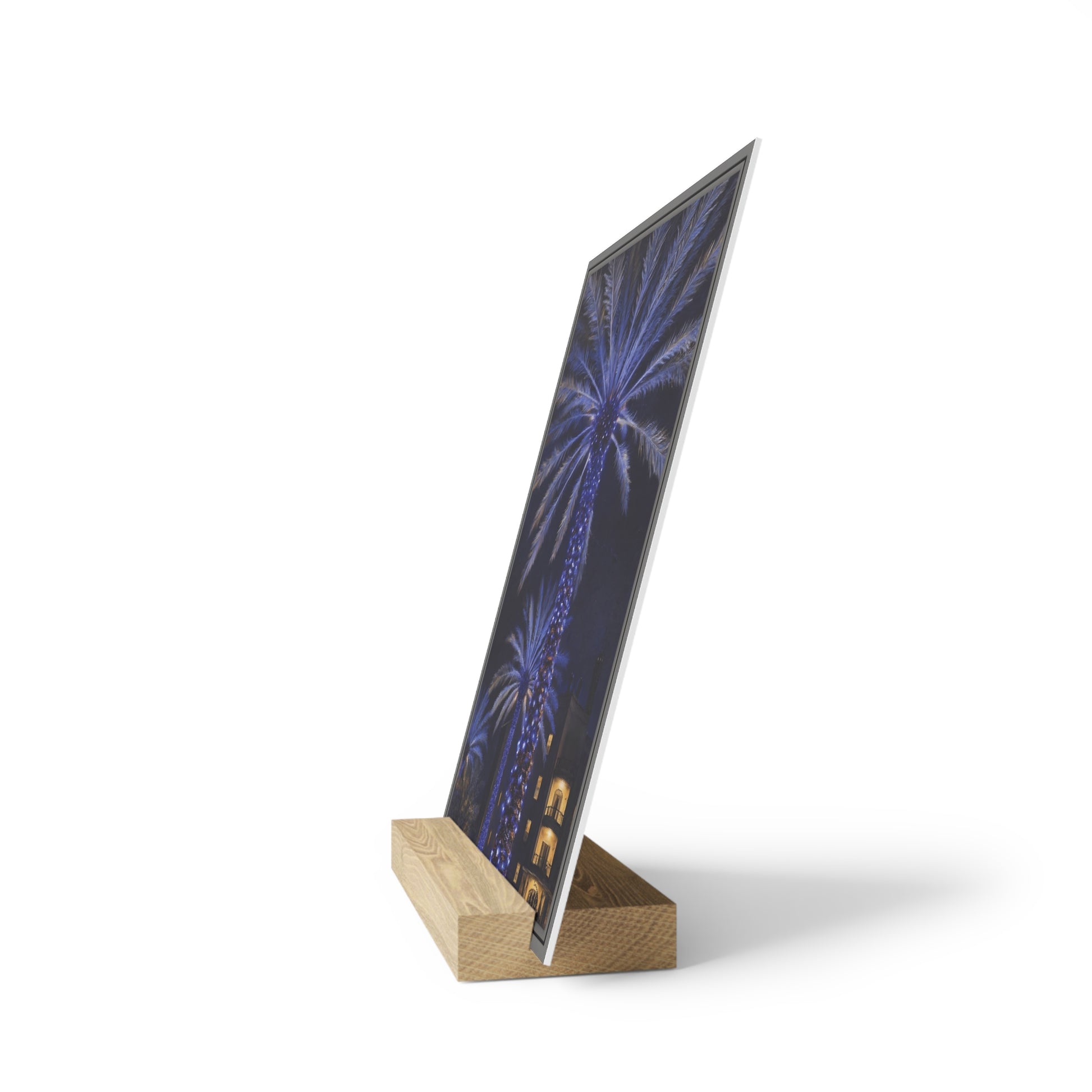 A simple, beautiful artist-style tropical blue-lighted palm trees night scene gallery board mounted on a hand-crafted oak stand brings small-scale art to life. The textured 1.8mm art board receives a giclée print, preserving fine detail and soft, painterly tones. The solid oiled oak base is made in the UK and holds the board upright for tabletop display... a warm grain of the wood grounding the delicate, museum-like finish of the artwork. A perfect way to highlight this unique design in a compact space, this gallery board adds calm, considered presence to any corner of the home or office.