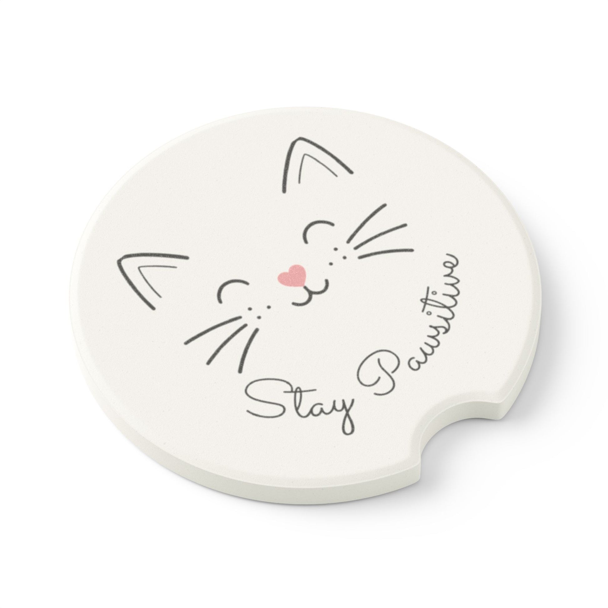 Catitude Collection Cat Face Soapstone Car Coaster — 'Stay Pawsitive' Car Cup Holder Coaster (Single or 2-Piece Set)