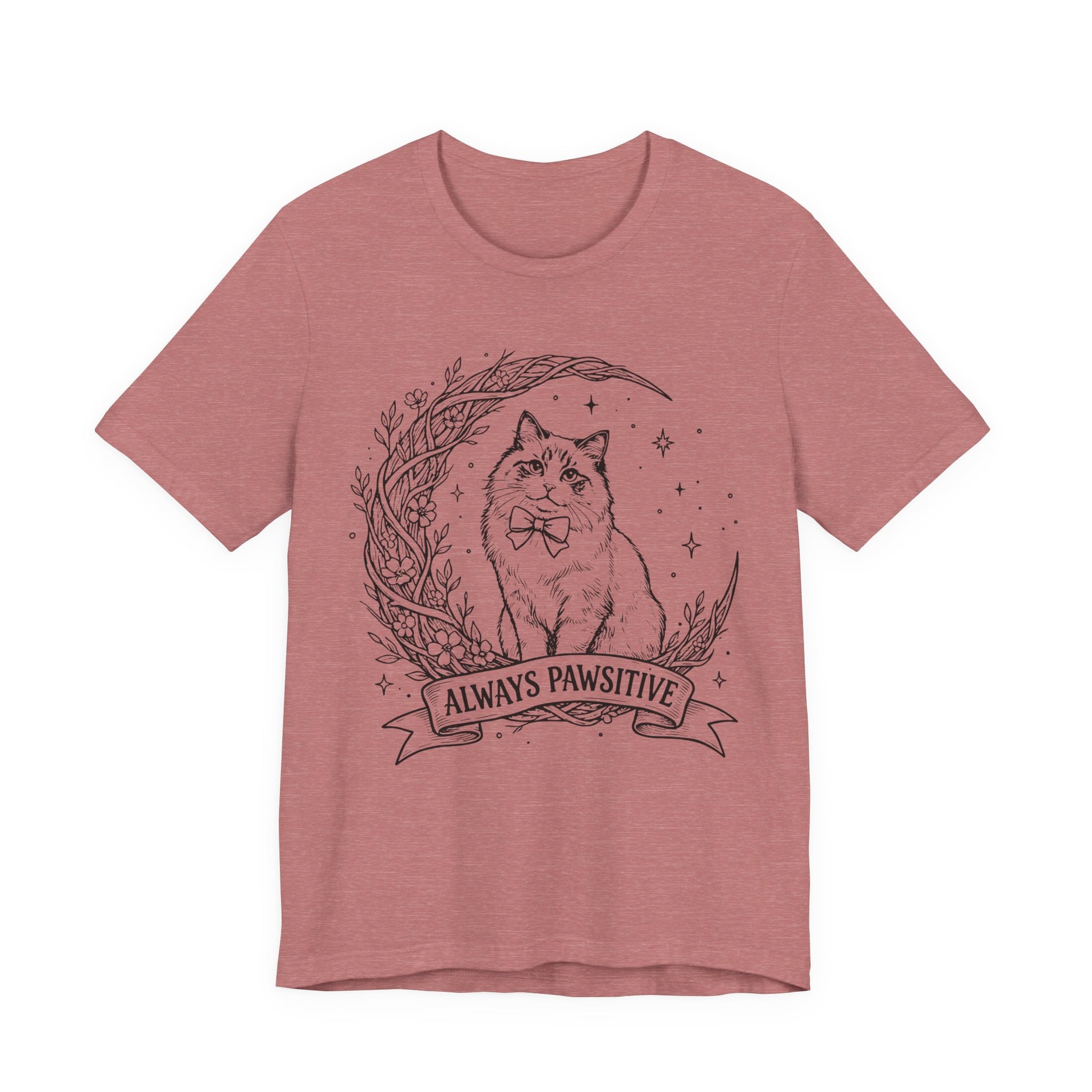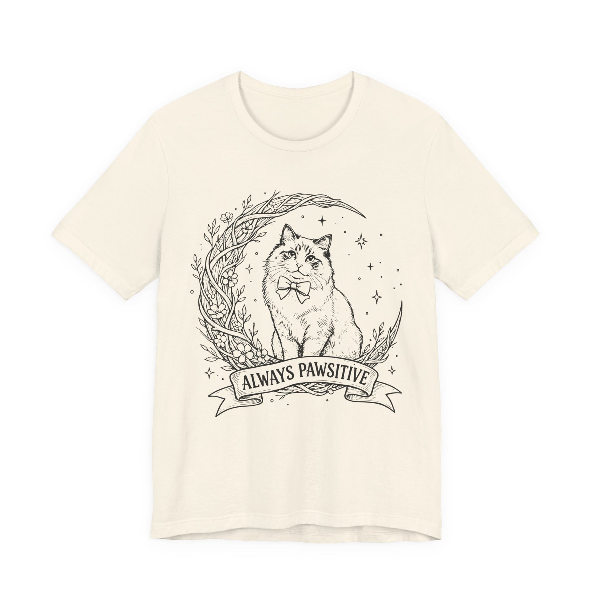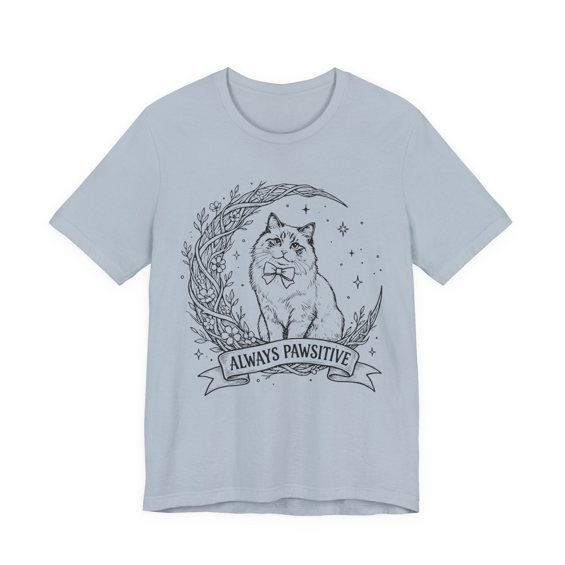 Soft, breathable, and hand-drawn charming: this lightweight Bella+Canvas adult unisex jersey tee brings a quiet, optimistic vibe to everyday wear. A finely detailed sketch of a fluffy cat sits inside a crescent of foliage and stars, with a banner that reads “Always Pawsitive” from our Catitude Collection. The monochrome illustration feels like a cozy midnight doodle—subtle, personal, and a little whimsical—so it layers easily under jackets or stands on its own for a relaxed look. Wear it when you need a gentle reminder to smile, while wandering downtown, lounging with your pet, or meeting friends for a low-key coffee break. The balanced retail fit and classic crew neckline keep the silhouette neat and wearable, while responsibly made cotton keeps the feel soft against skin.