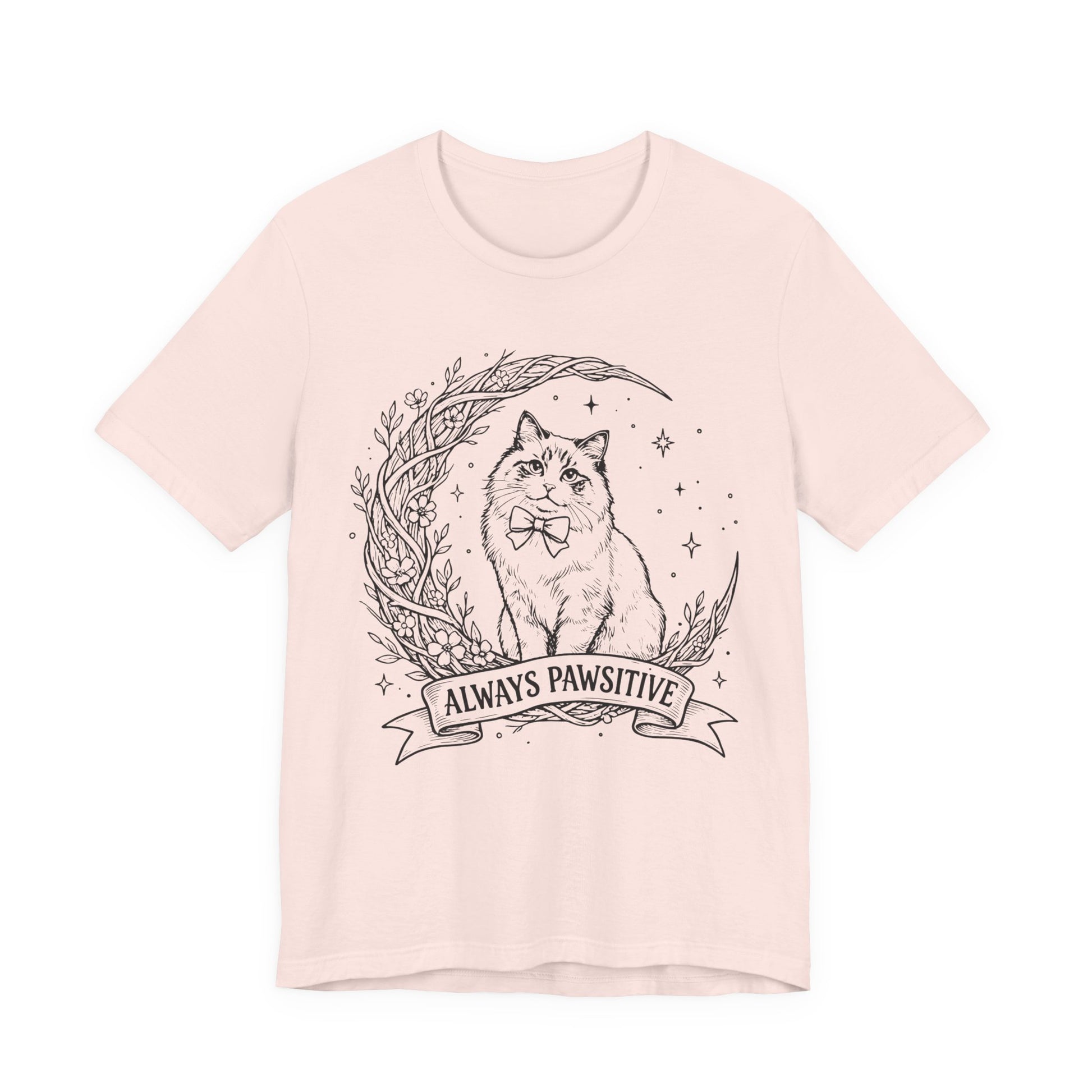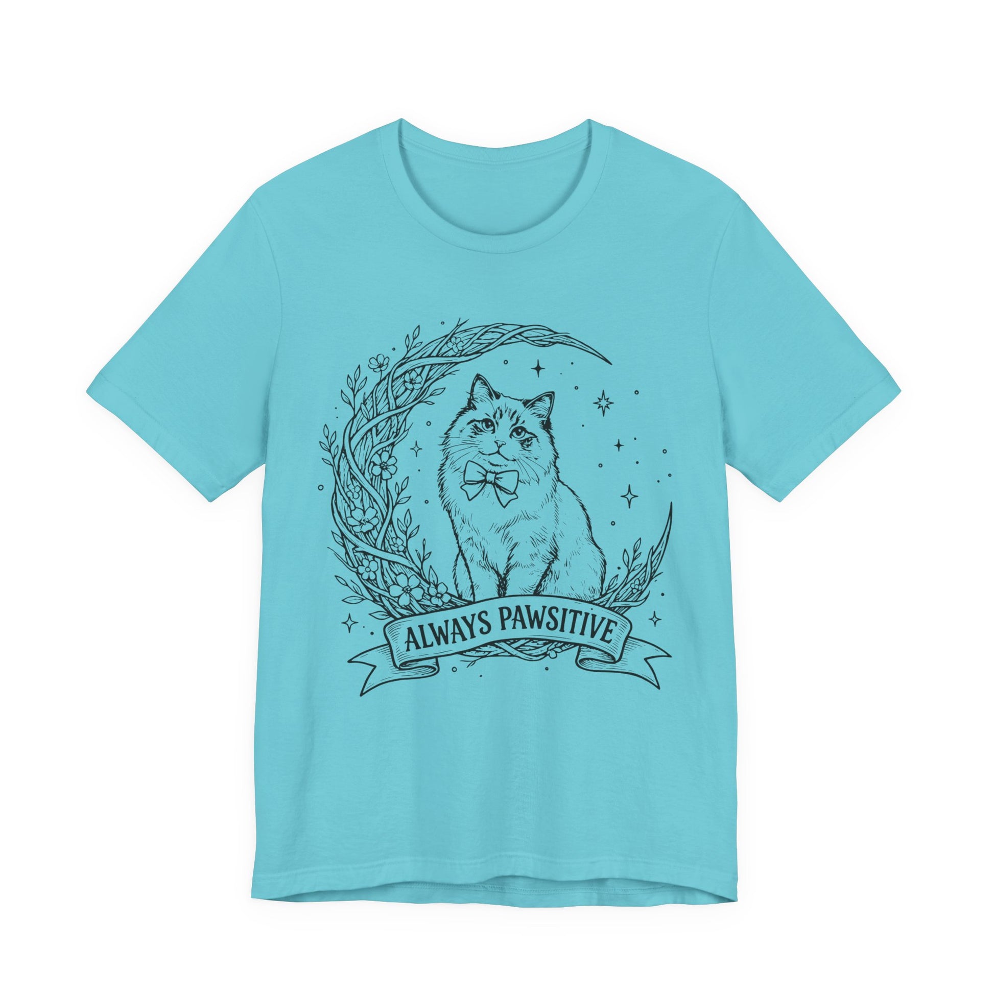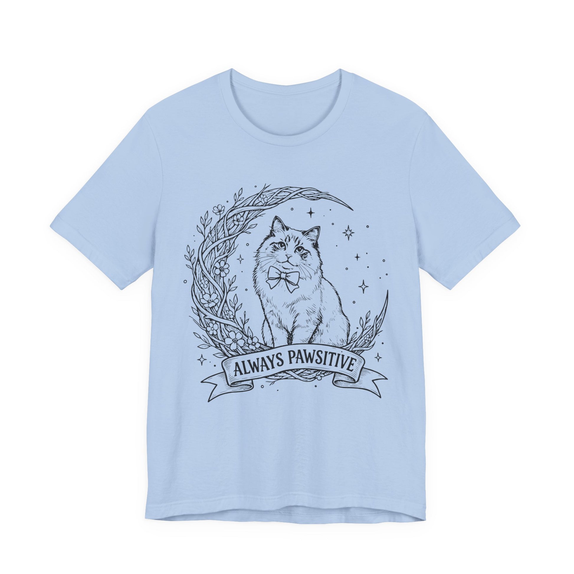 Soft, breathable, and hand-drawn charming: this lightweight Bella+Canvas adult unisex jersey tee brings a quiet, optimistic vibe to everyday wear. A finely detailed sketch of a fluffy cat sits inside a crescent of foliage and stars, with a banner that reads “Always Pawsitive” from our Catitude Collection. The monochrome illustration feels like a cozy midnight doodle—subtle, personal, and a little whimsical—so it layers easily under jackets or stands on its own for a relaxed look. Wear it when you need a gentle reminder to smile, while wandering downtown, lounging with your pet, or meeting friends for a low-key coffee break. The balanced retail fit and classic crew neckline keep the silhouette neat and wearable, while responsibly made cotton keeps the feel soft against skin.