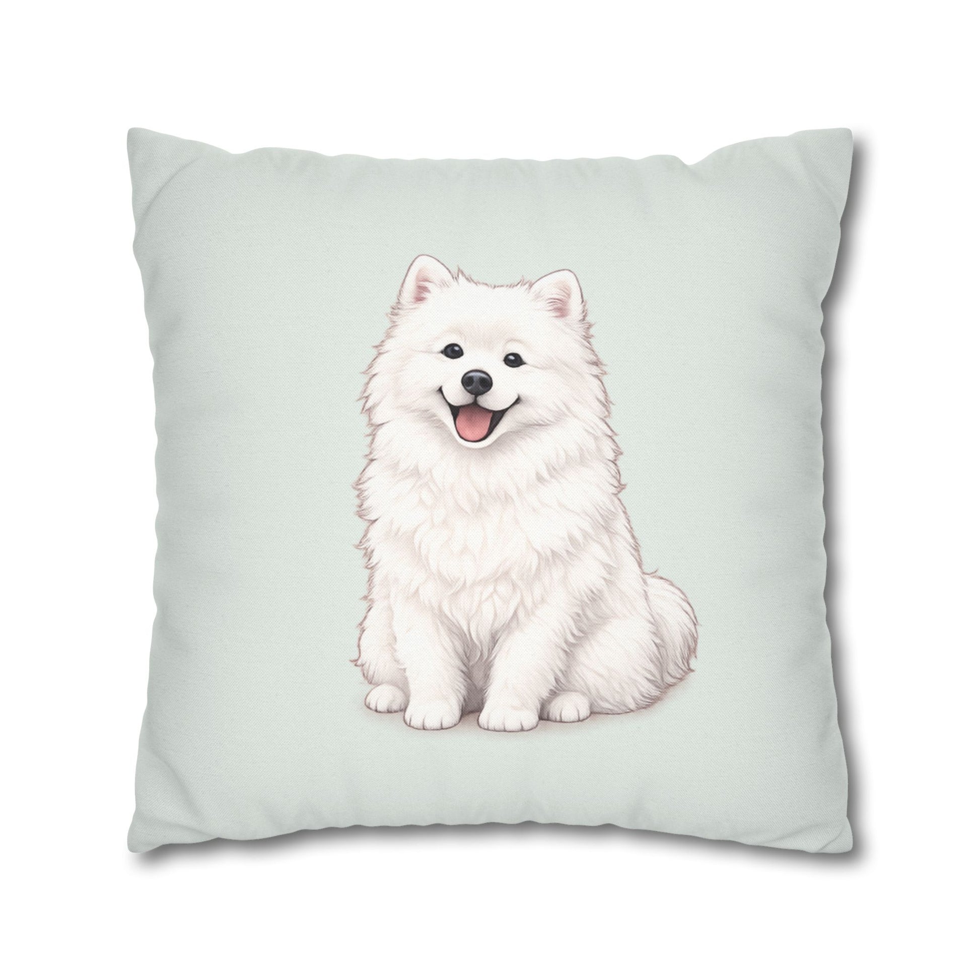 - Double-sided print: patterned front with striped design, single Samoyed puppy on solid background on back