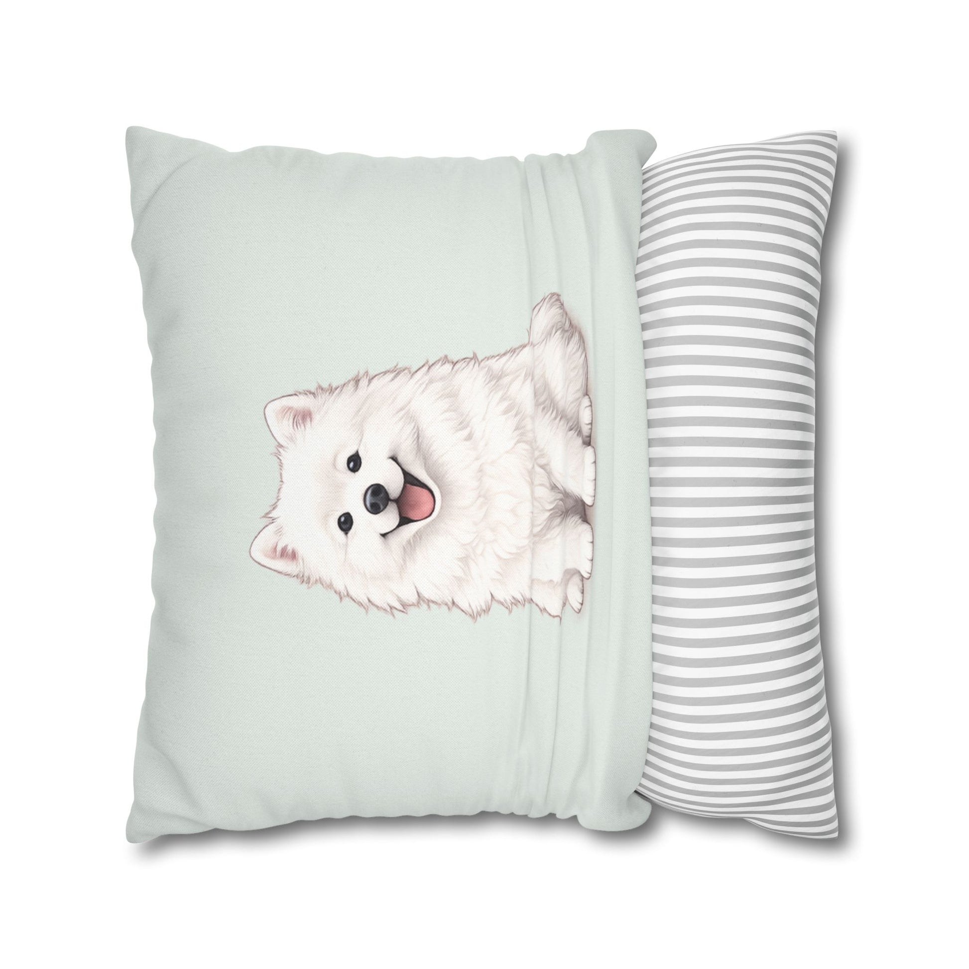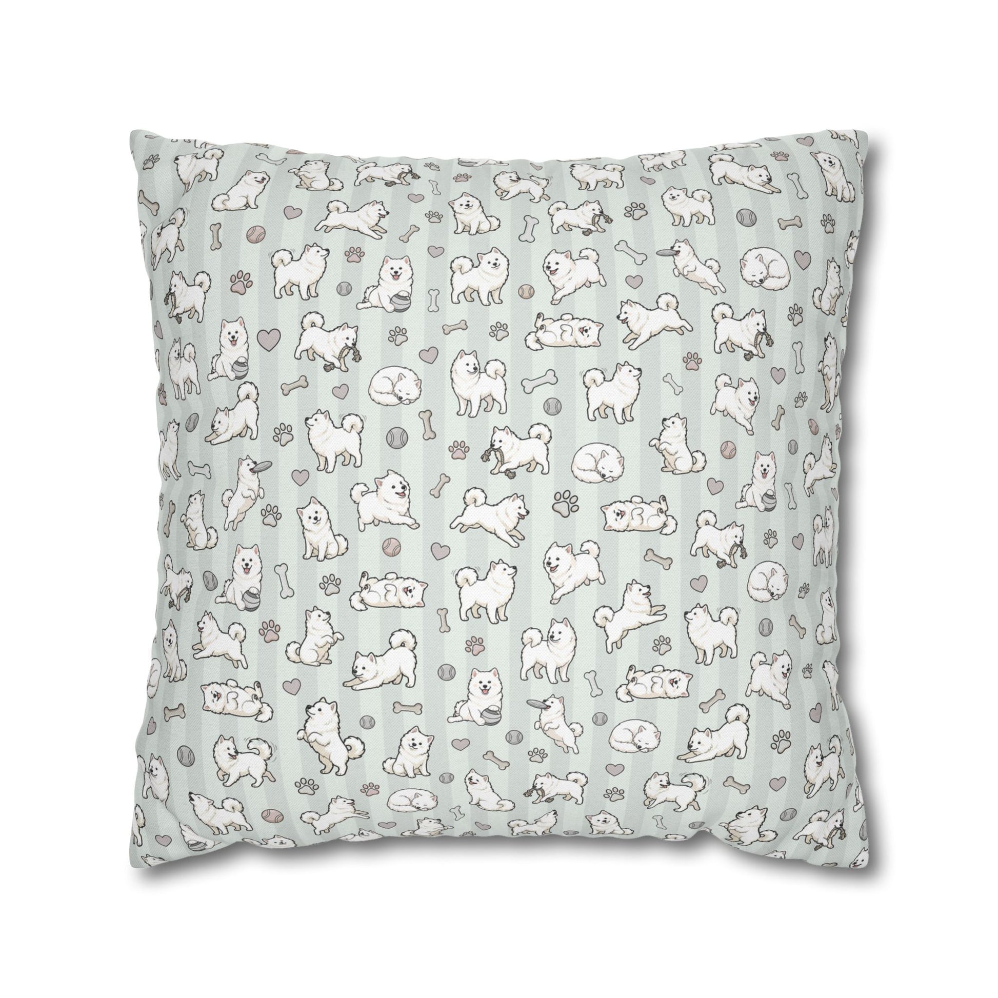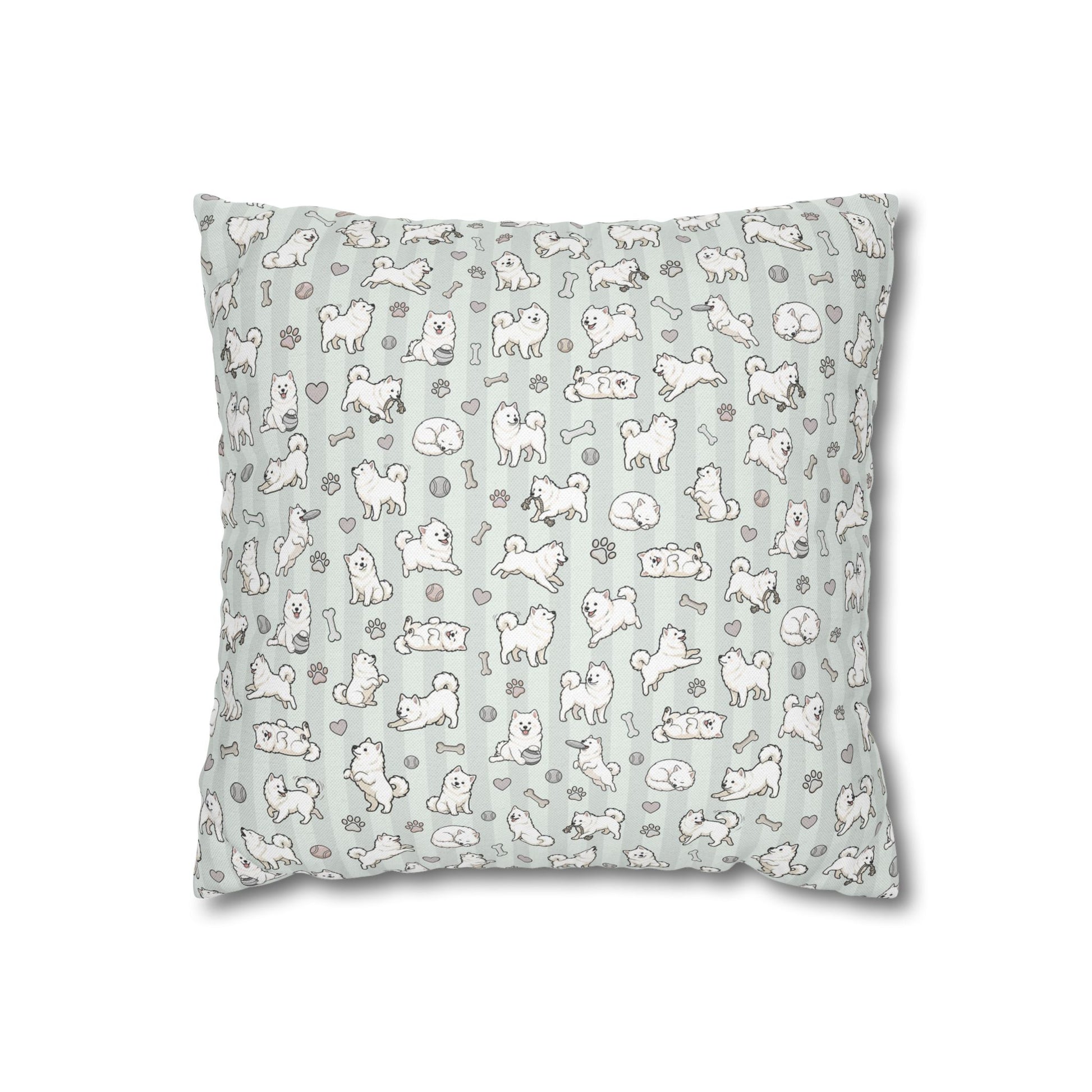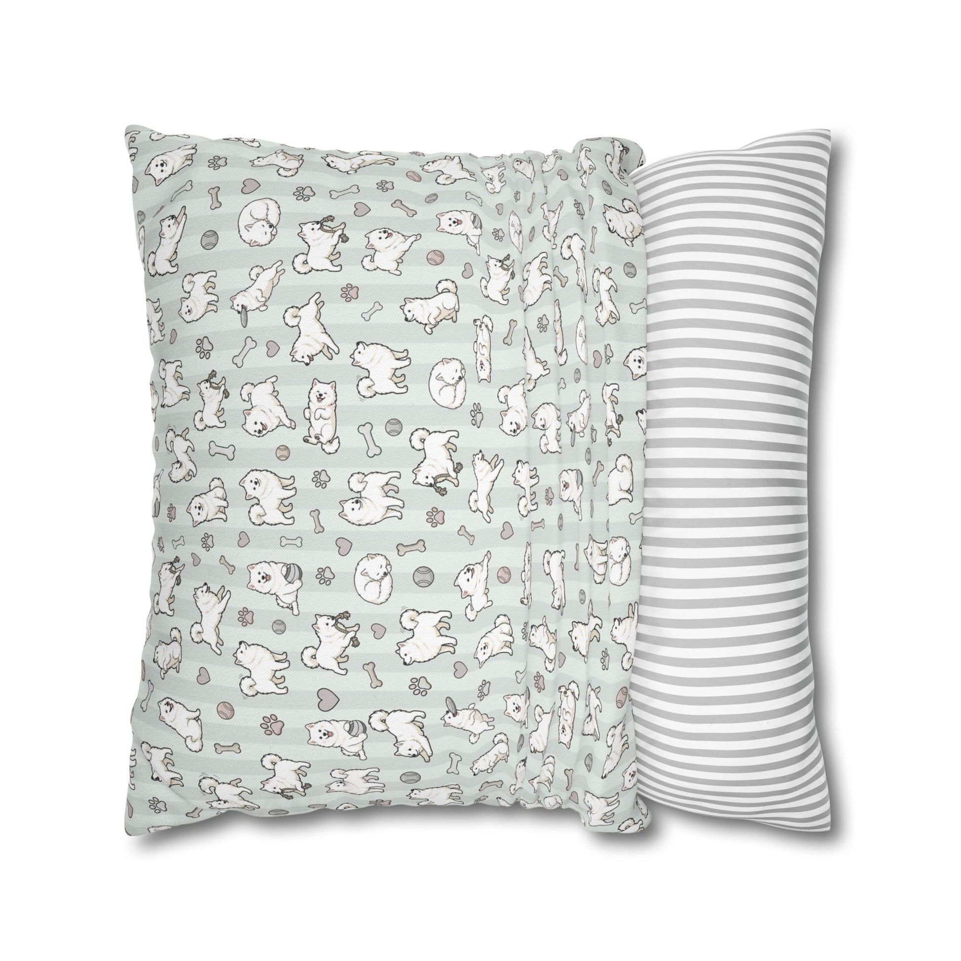 Double Sided Sage Green Samoyed Puppy With Bones, Hearts, and Paw Prints Design Pillowcase — Soft Striped Decorative Square Throw Pillow (Additional Sizes)