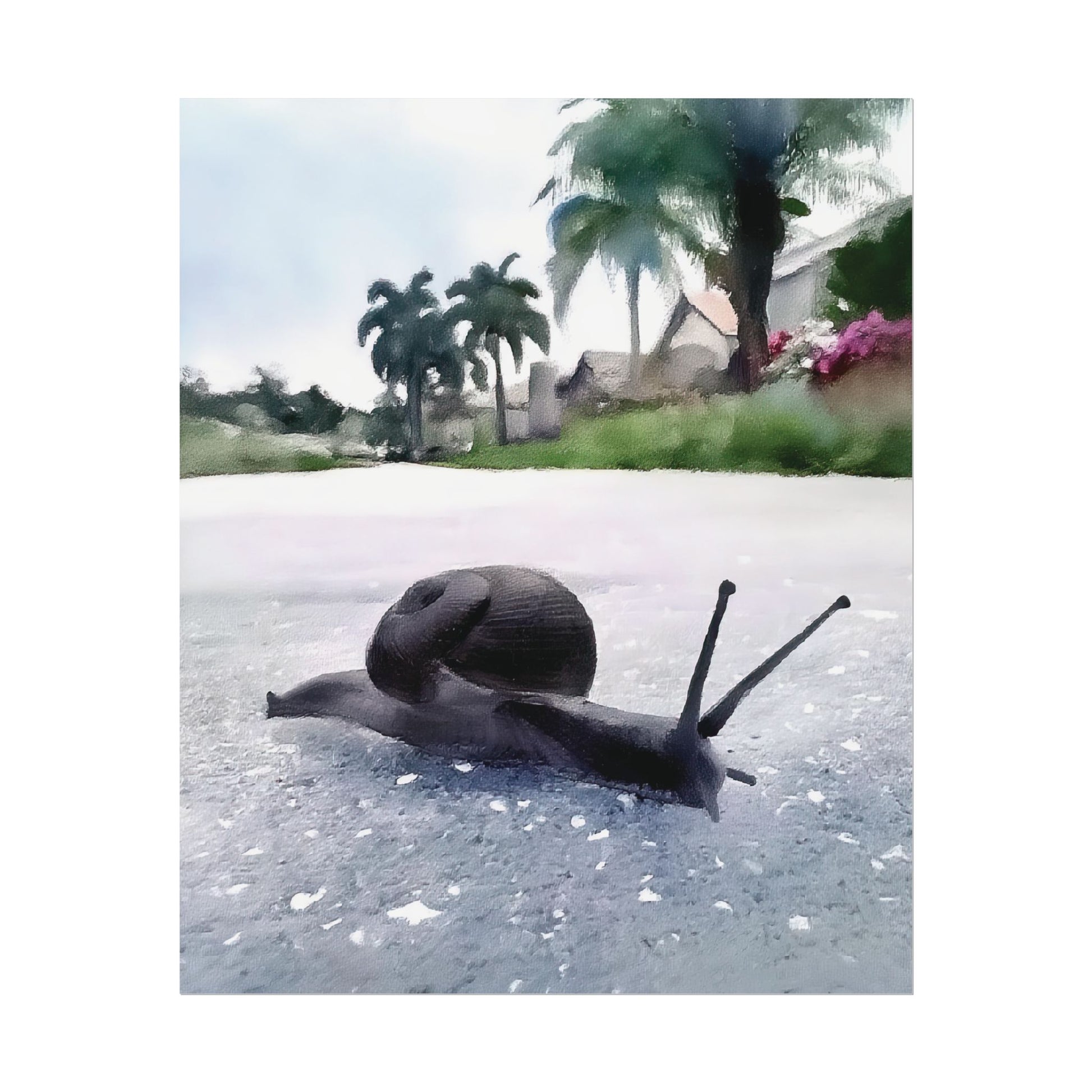 Captured: a quiet, tropical moment as a snail makes its slow, determined crossing through a sun-warmed neighborhood. Soft palms and pastel houses blur into the background while the snail becomes the gentle focal point — a tiny traveler in a laid-back world. This watercolor-style print invites you to pause, breathe, and notice the small stories happening at ground level. Hang it in a hallway, studio, or a cozy reading nook to bring a touch of island calm and attentive stillness to everyday spaces. The artwork’s rich colors and subtle textures read beautifully from a distance or up close, and the choice of fine art, semi-glossy, or matte papers lets you tailor the mood from tactile and textured to bright and photographic. Print perspective will vary depending on size chosen - select 'Fine Art' paper choice to compare.