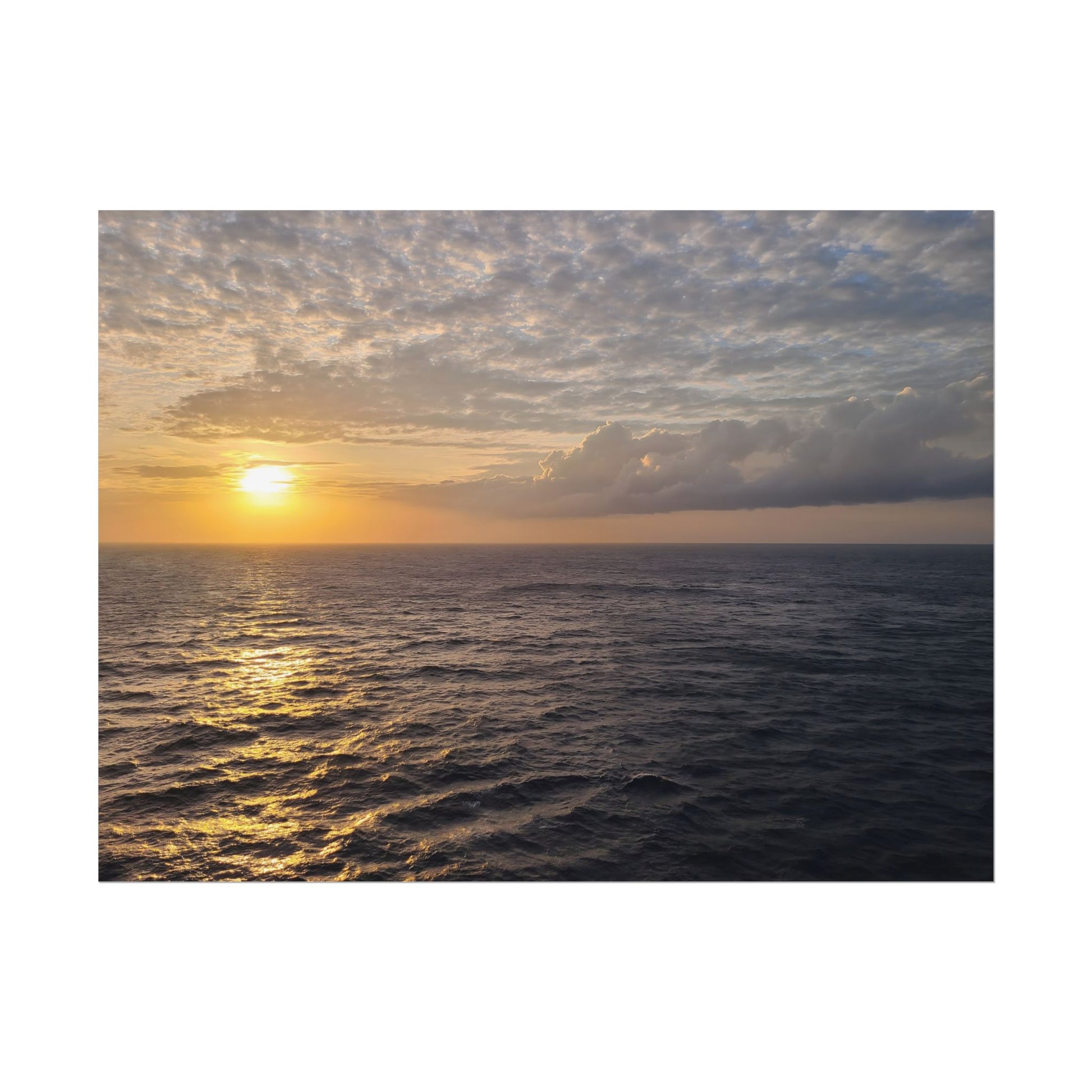 Bring a touch of the outdoors to your indoor living space or office with this unique ocean sunset theme print. Perfect for nature lovers, sunset lovers, and art enthusiasts, this piece will bring a sense of calm and serenity to any environment. Print perspective will vary slightly depending on size chosen - sizes are available to view if 'Fine Art' paper choice is selected.