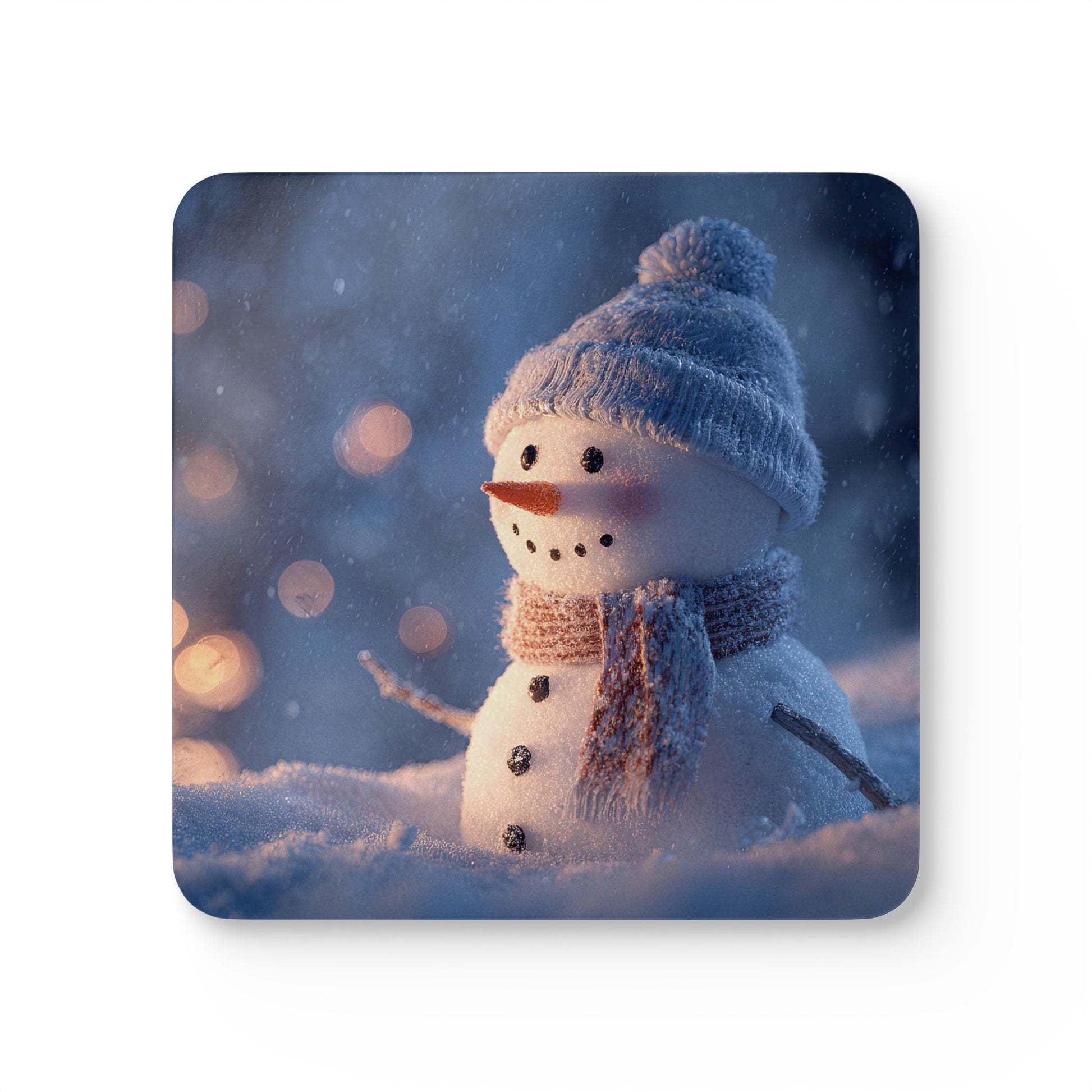 Warm light on frosty nights. These square cork-backed coasters showcase a cheerful snowman scene in rich, glossy color—soft blues, glowing bokeh, and the knit texture of a little winter hat. They sit quietly on your table, adding a gentle seasonal touch. Great for hosting a small holiday gathering, or for decorating a mantel. Durable MDF with a high-gloss print keeps the image vivid; the cork underside grips wood and stone without scratching. Simple and quietly festive—these coasters make cold-weather moments feel a little bit more cozy .
