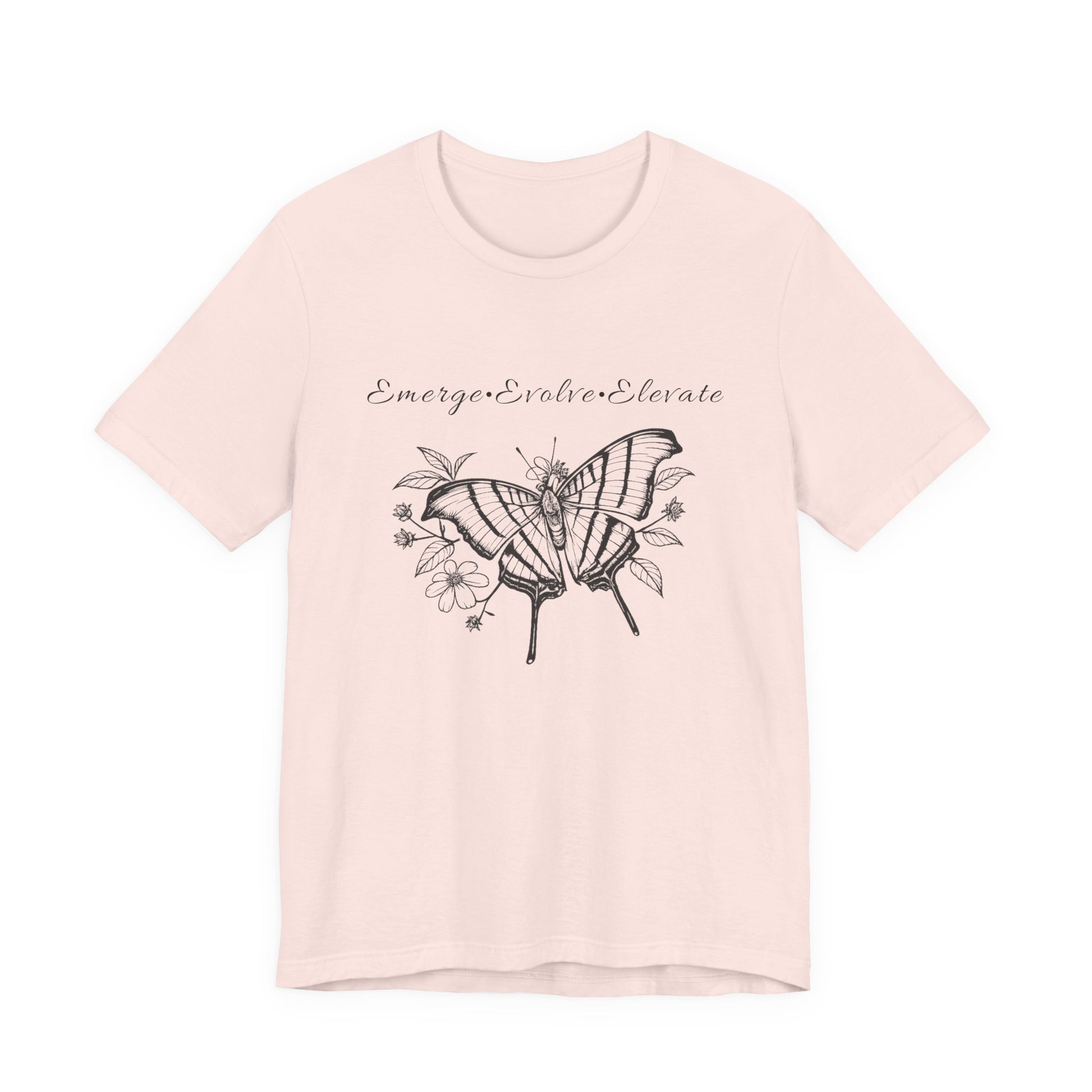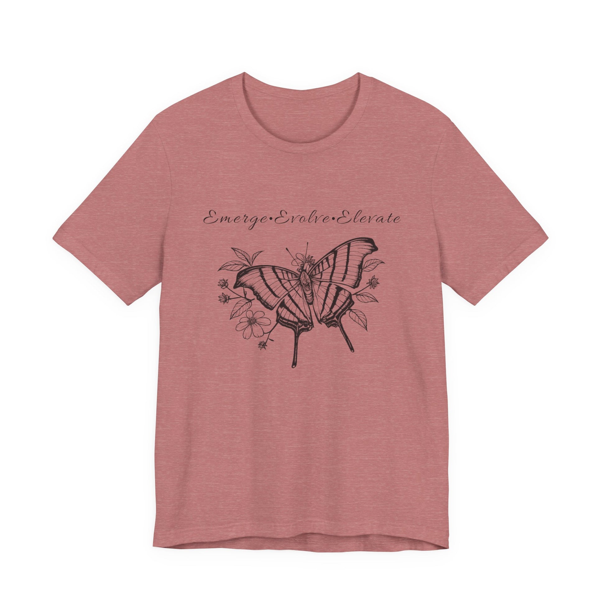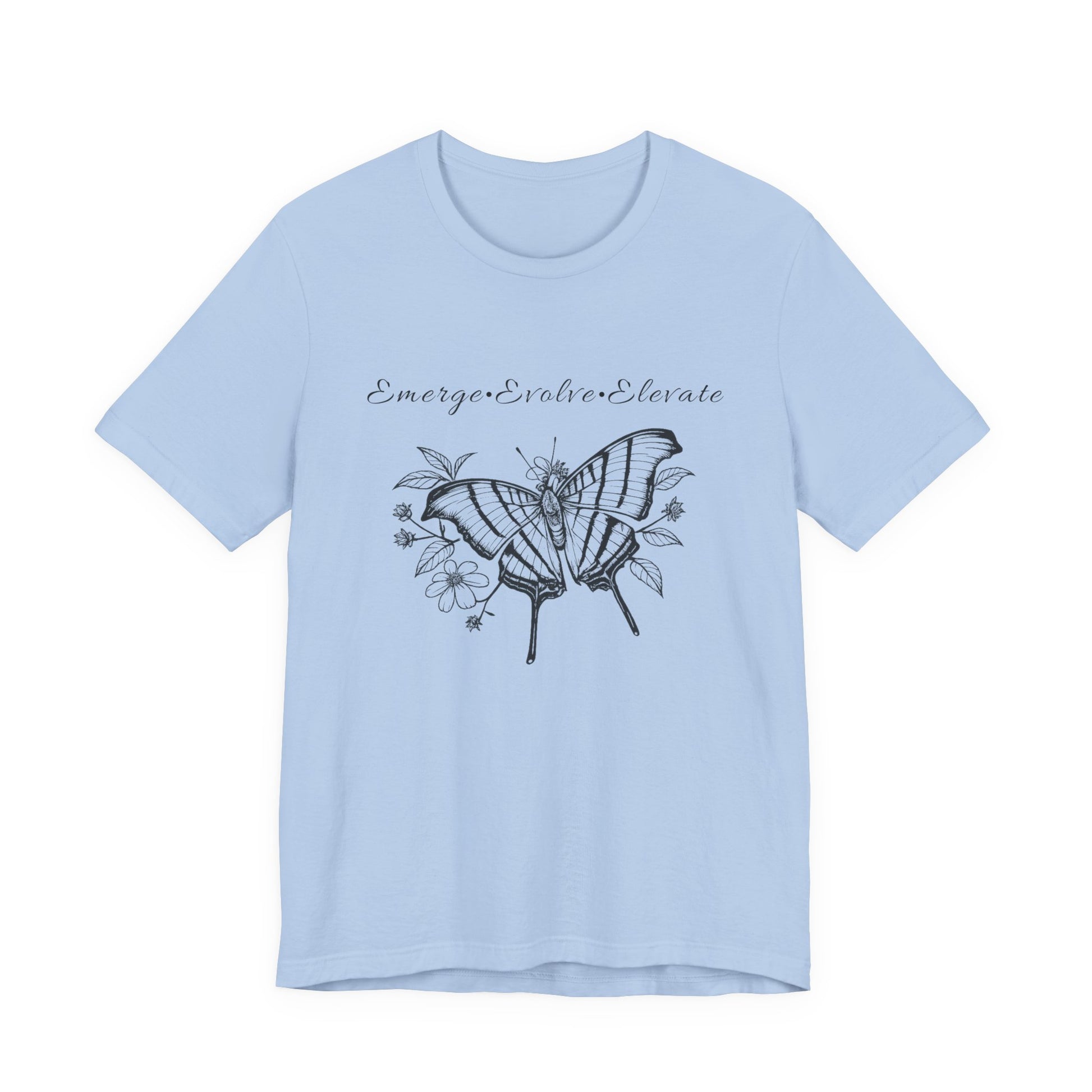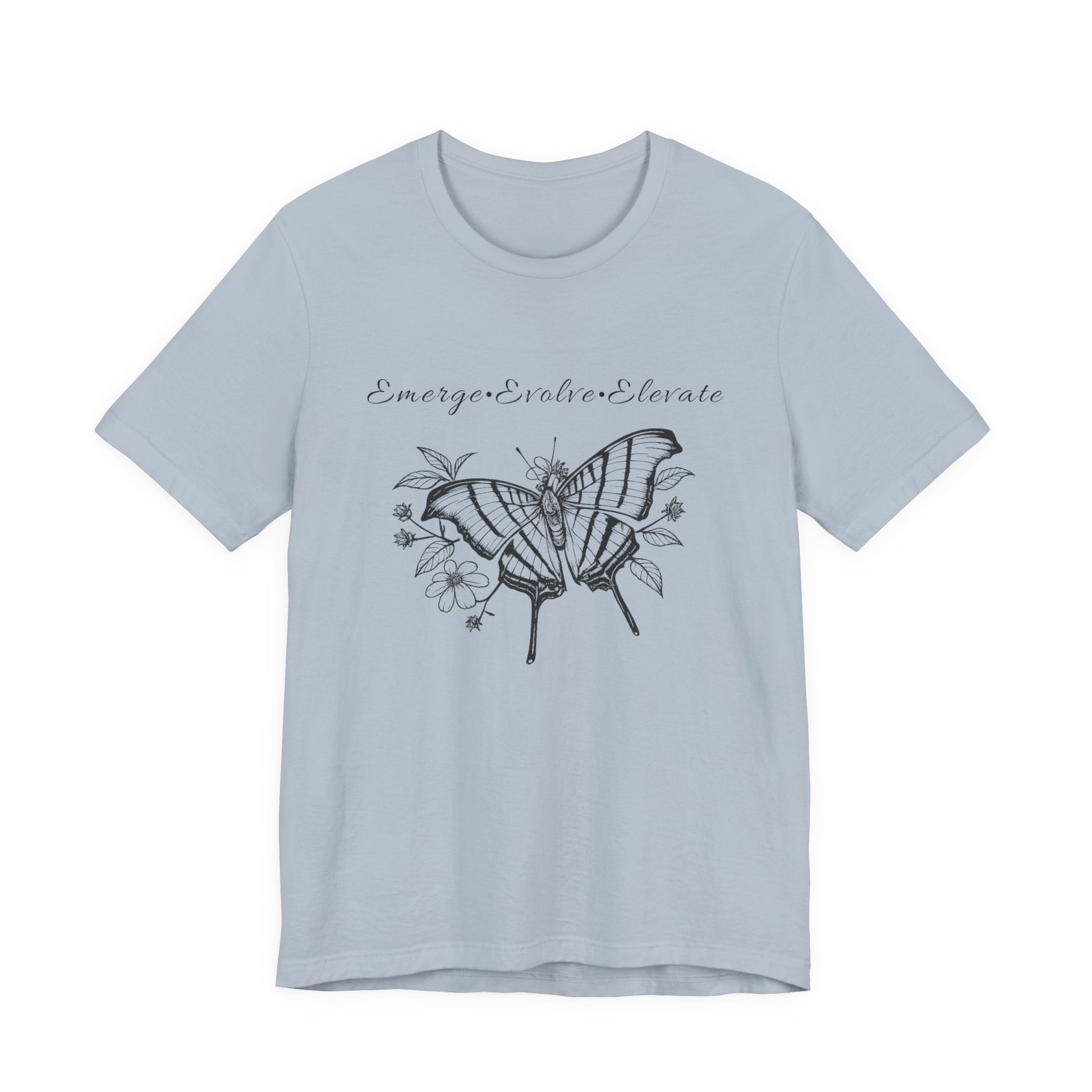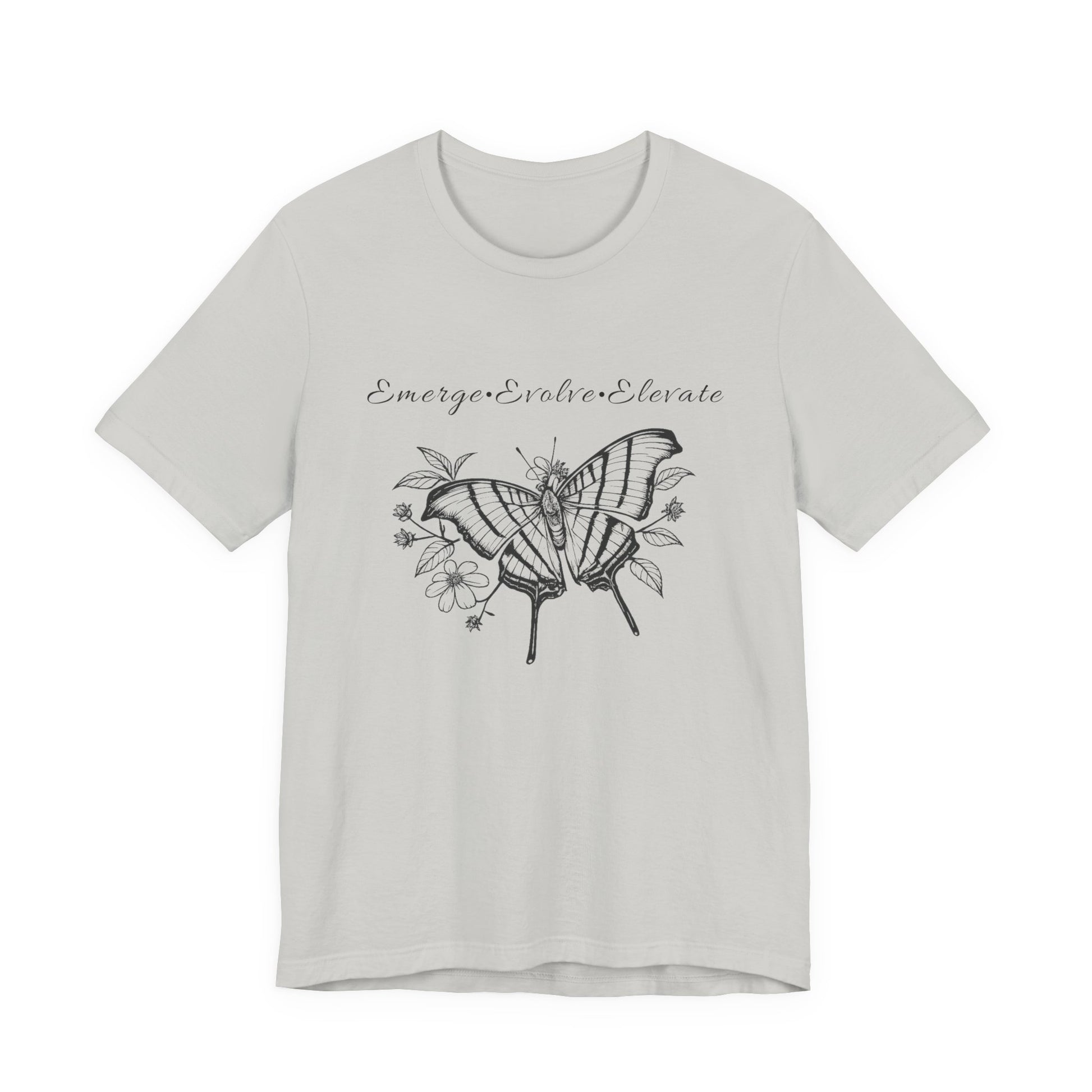 Lightweight and softly structured, this Bella+Canvas tee carries a hand-inked black butterfly and floral illustration with the uplifting mantra: Emerge, Evolve, Elevate. Wear it on slow mornings when you need a quiet reminder to keep growing. The sketchy wings and delicate petals feel intimate — like a page torn from a nature journal — while the flowing script above them nudges you forward without shouting. It slips easily under a cardigan for a desk day, pairs with worn denim for a weekend walk, and layers beneath a jacket for crisp, reflective evenings. For people who find meaning in small rituals and subtle symbols, this tee becomes part of the daily practice: a soft, breathable layer that speaks the language of gentle transformation.