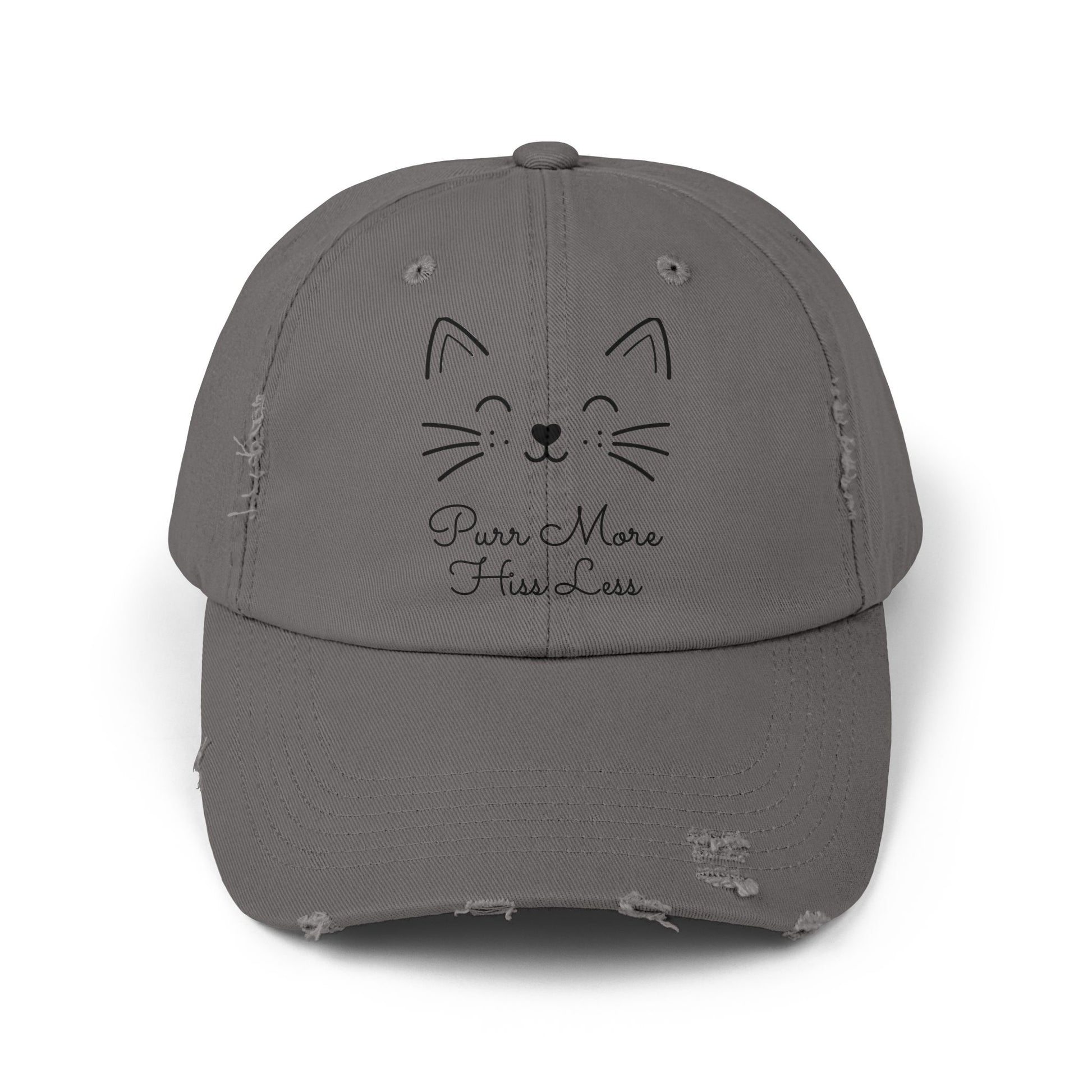 Unisex Cat Face Design Distressed Cap - 'Purr More, Hiss Less' Hat (Additional Colors)